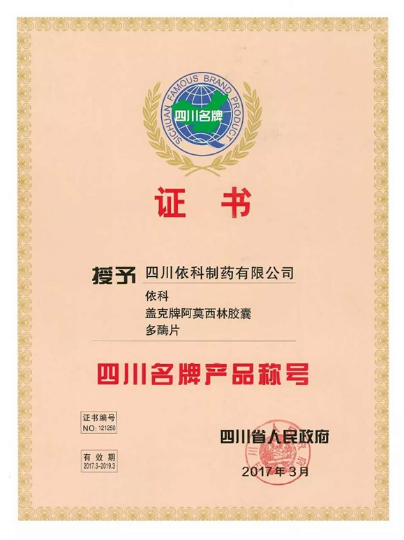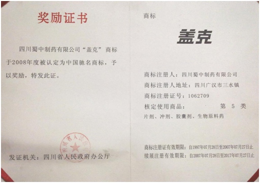 公司高度重视品牌战略,依法注册了“盖克”、“蜀中”、“三星堆”、“阿莫锋”、“益善源”、“蓉通”、“尊龙人生就是博首页登录”等108件注册商标,1999年“盖克”、2003年“蜀中”、2007年“三星堆”被认定为德阳市知名商标,2001年“盖克”、2004年“蜀中”被认定为四川省著名商标, 2008年“盖克”商标被国家工商行政管理总局认定为“中国驰名商标”。2017年3月,公司盖克牌、尊龙人生就是博首页登录牌阿莫西林胶囊和多酶片被四川省人民政府授予四川名牌产品称号。2016年,公司实现营业收入66373万元,利税7600万元;2017年,公司实现营业收入75045万元,利税7572万元。公司2017年被命名为德阳市第七批院士专家工作站,2016-2018连续三年被德阳市人民政府确定为重点龙头企业。